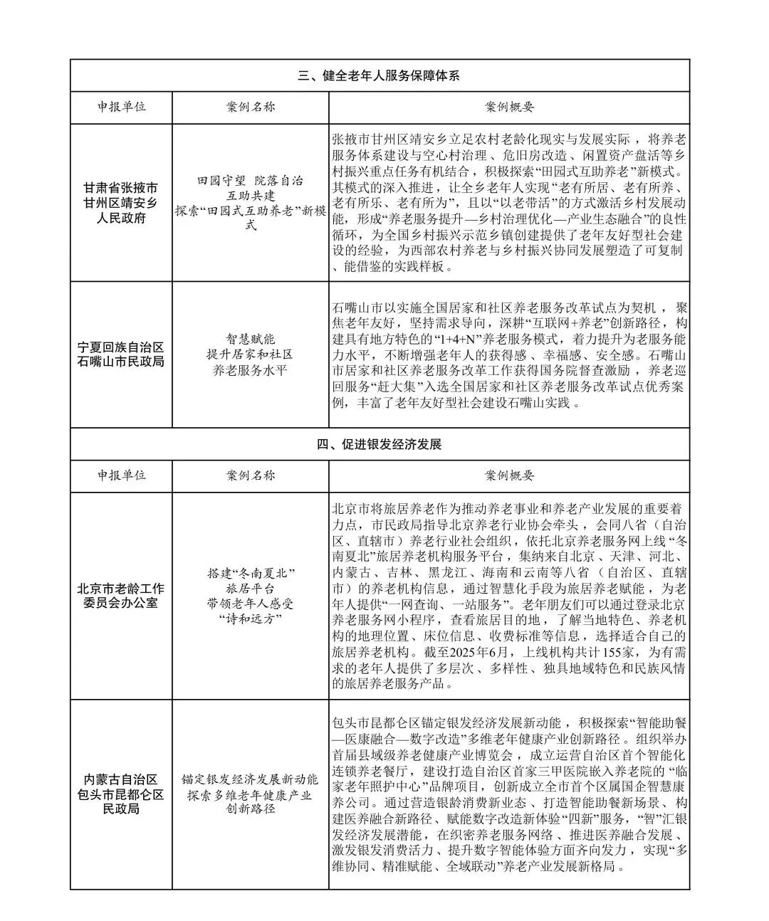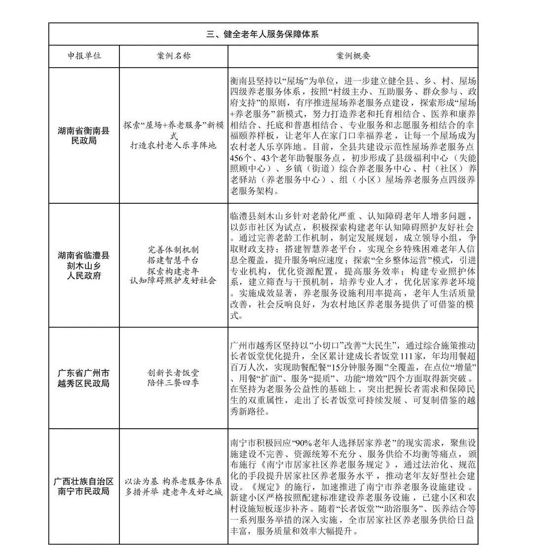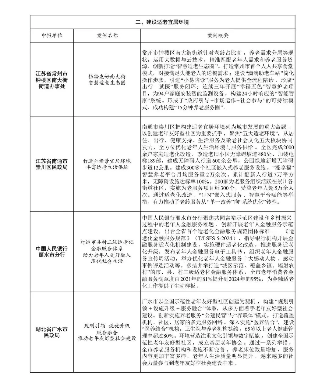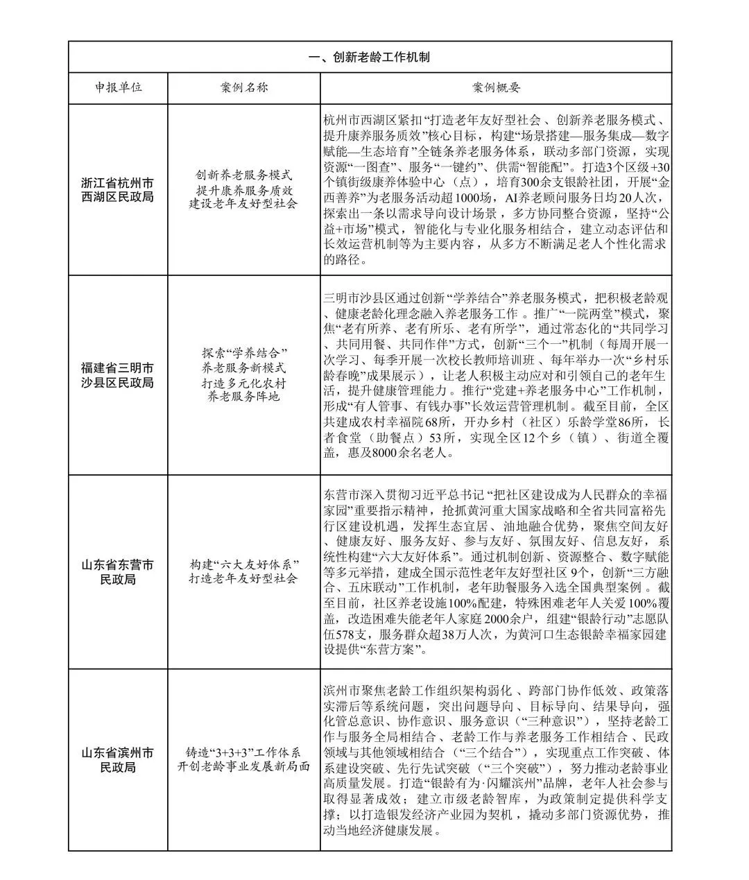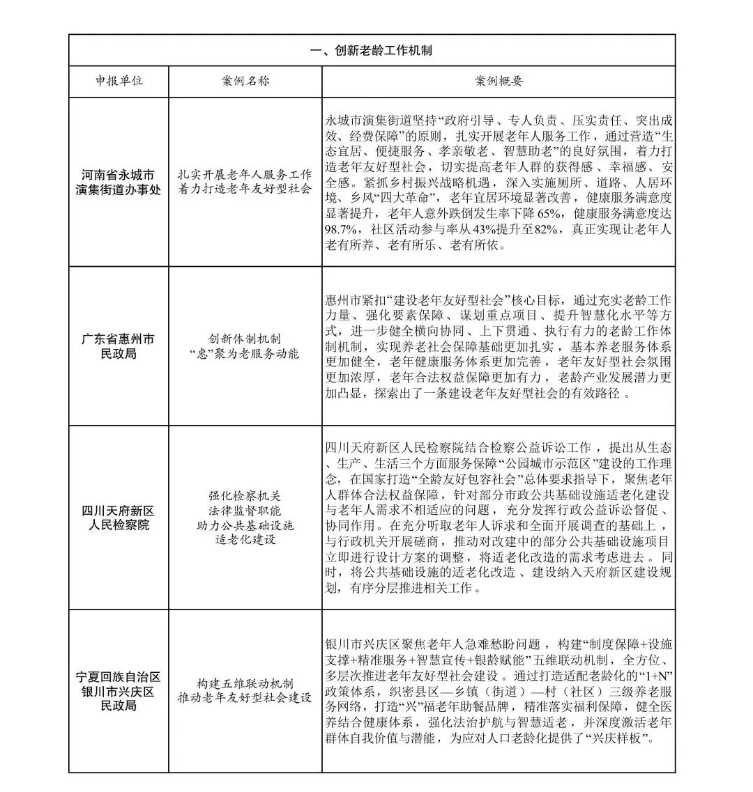为深入学习贯彻习近平总书记关于老龄工作的重要指示精神,全面贯彻落实党的二十大和二十届二中、三中全会关于老龄工作的决策部署,持续推进老年友好型社会建设,根据《全国老龄办关于开展老年友好型社会建设典型案例征集工作的通知》(全国老龄办函〔2025〕32号)有关工作安排,经过地方申报、省级老龄工作部门初审推荐、专家评审和综合比选,全国老龄办遴选了94个老年友好型社会建设典型案例,现予以发布,供各地参考借鉴。