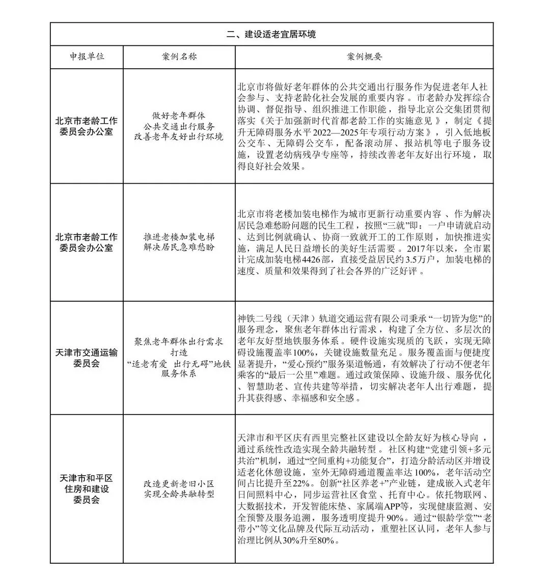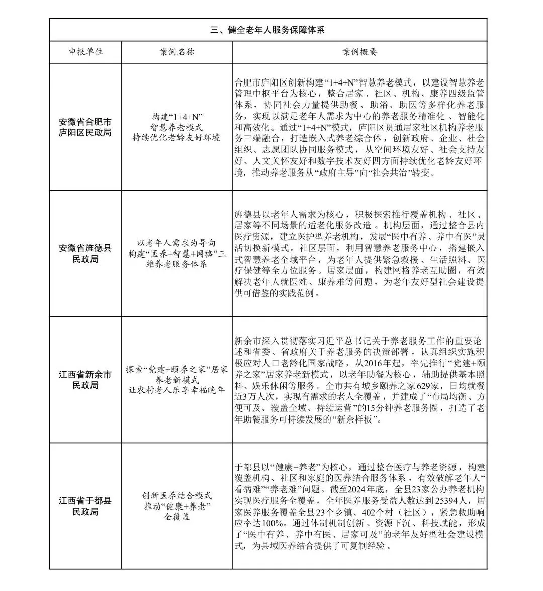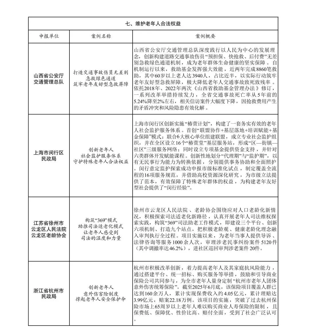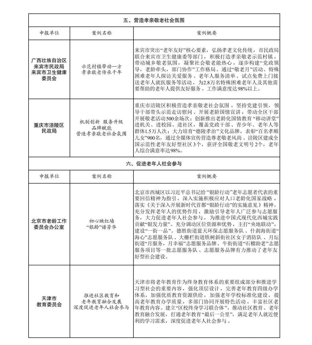 为深入学习贯彻习近平总书记关于老龄工作的重要指示精神,全面贯彻落实党的二十大和二十届二中、三中全会关于老龄工作的决策部署,持续推进老年友好型社会建设,根据《全国老龄办关于开展老年友好型社会建设典型案例征集工作的通知》(全国老龄办函〔2025〕32号)有关工作安排,经过地方申报、省级老龄工作部门初审推荐、专家评审和综合比选,全国老龄办遴选了94个老年友好型社会建设典型案例,现予以发布,供各地参考借鉴。