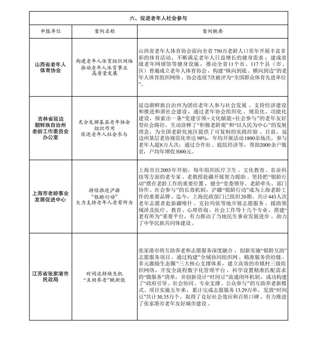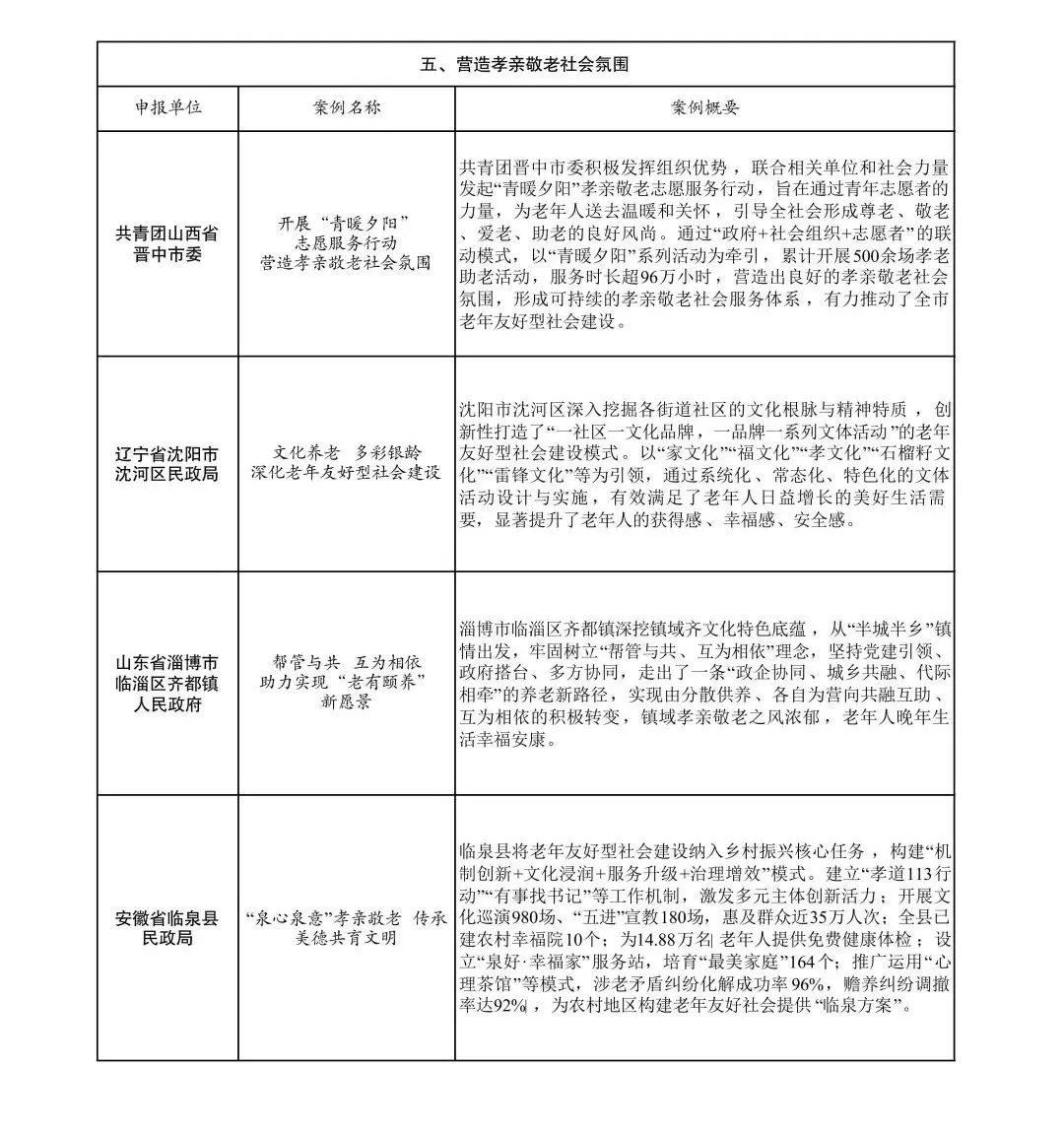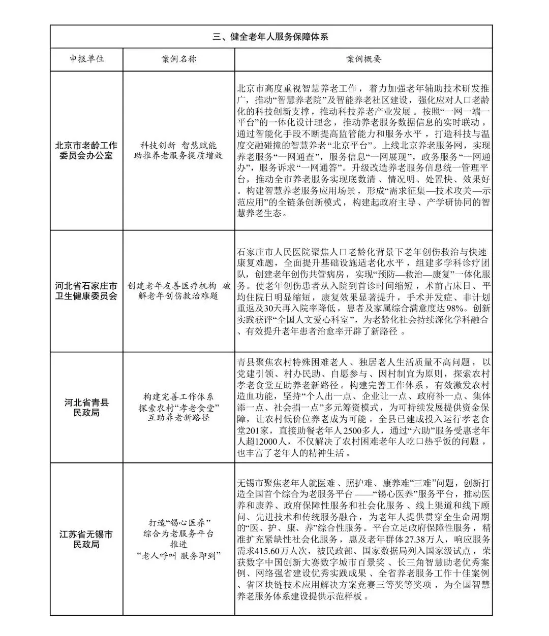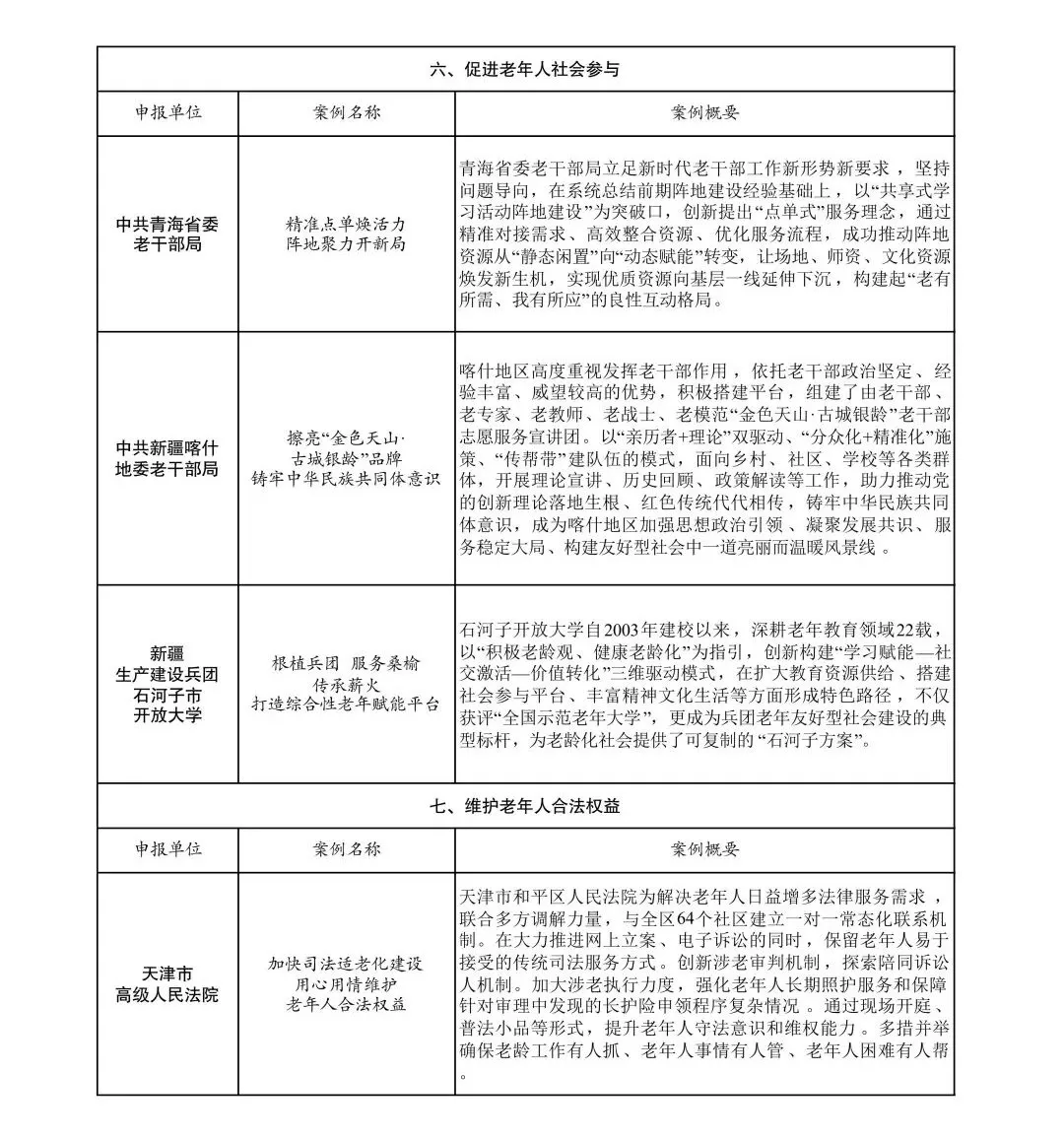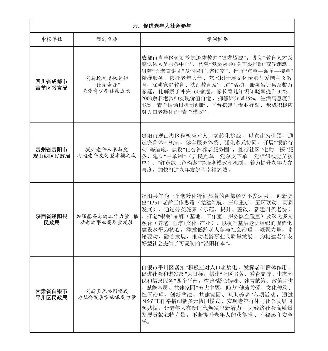 为深入学习贯彻习近平总书记关于老龄工作的重要指示精神,全面贯彻落实党的二十大和二十届二中、三中全会关于老龄工作的决策部署,持续推进老年友好型社会建设,根据《全国老龄办关于开展老年友好型社会建设典型案例征集工作的通知》(全国老龄办函〔2025〕32号)有关工作安排,经过地方申报、省级老龄工作部门初审推荐、专家评审和综合比选,全国老龄办遴选了94个老年友好型社会建设典型案例,现予以发布,供各地参考借鉴。