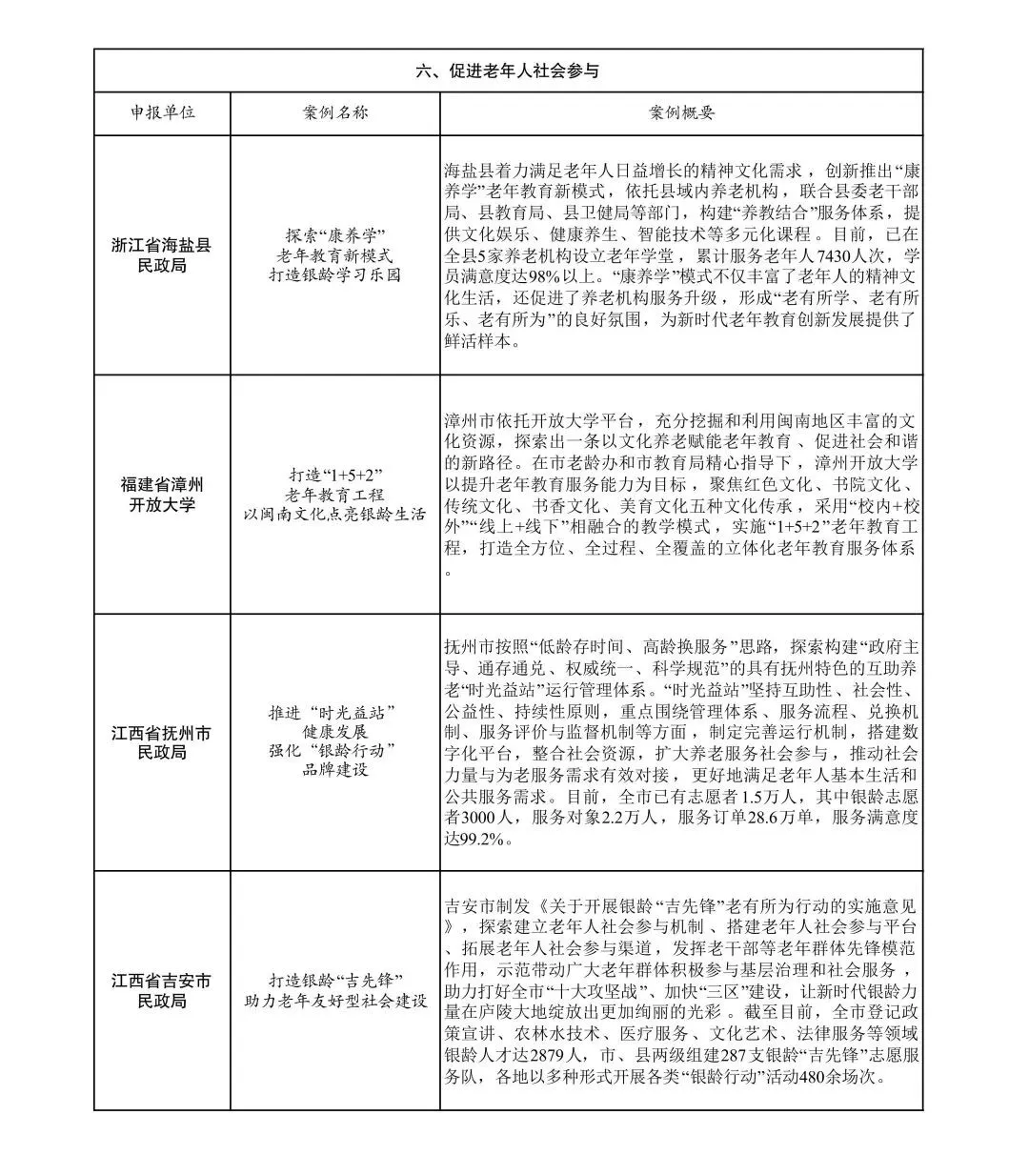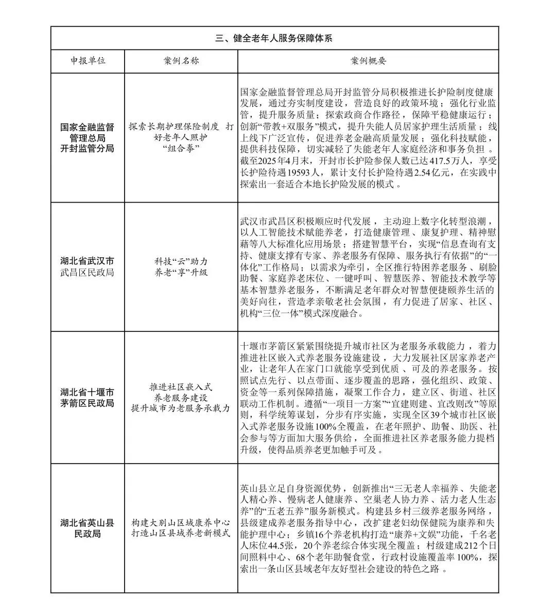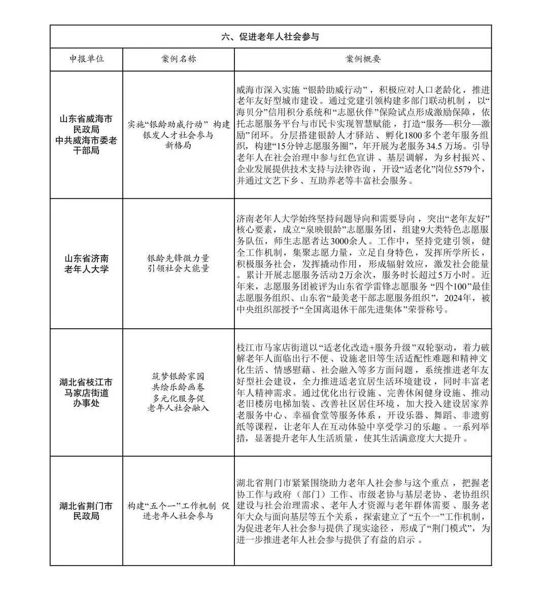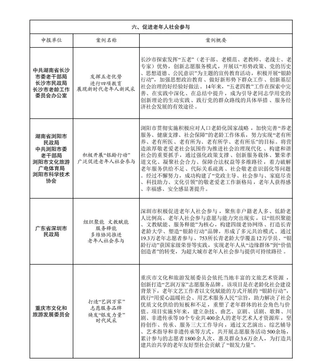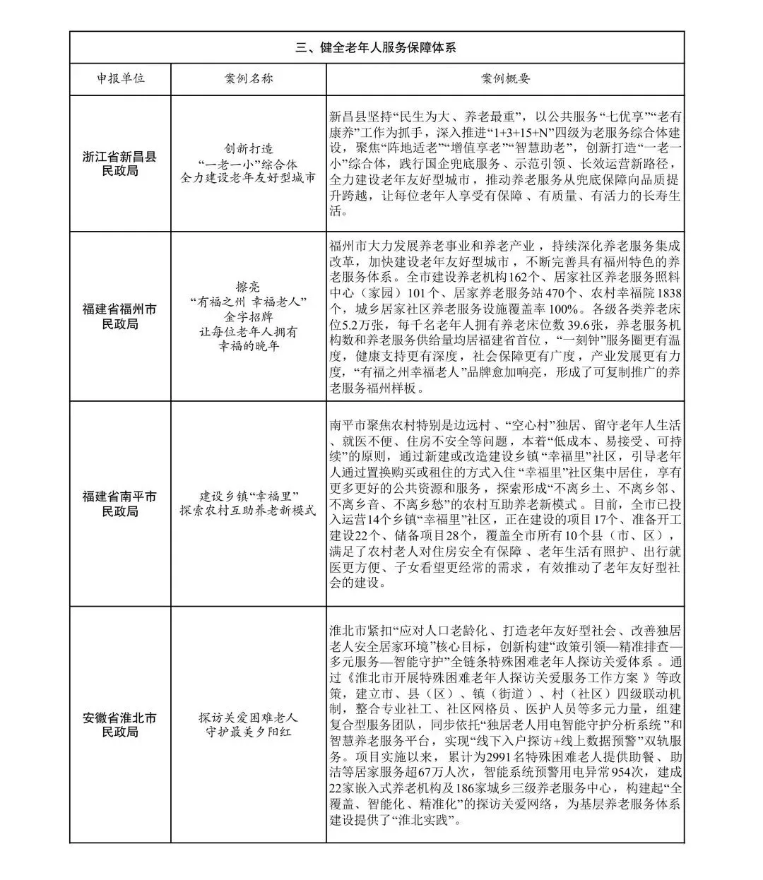 为深入学习贯彻习近平总书记关于老龄工作的重要指示精神,全面贯彻落实党的二十大和二十届二中、三中全会关于老龄工作的决策部署,持续推进老年友好型社会建设,根据《全国老龄办关于开展老年友好型社会建设典型案例征集工作的通知》(全国老龄办函〔2025〕32号)有关工作安排,经过地方申报、省级老龄工作部门初审推荐、专家评审和综合比选,全国老龄办遴选了94个老年友好型社会建设典型案例,现予以发布,供各地参考借鉴。